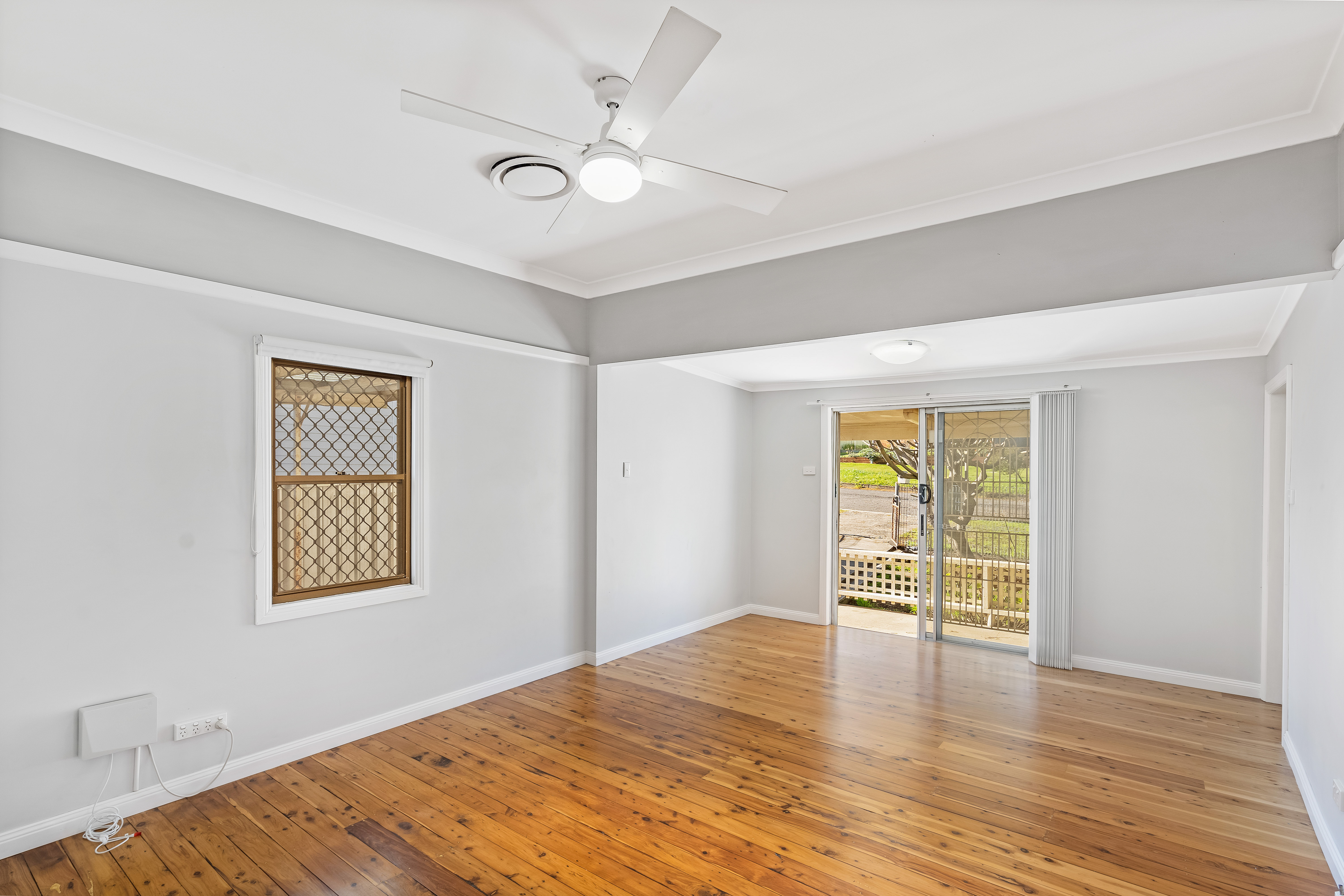 LOUNGE ROOM Original timber floors Dome light Ceiling fan Ornate steel security screen door Diamond grill security window grill Double sliding glass doors Vertical blinds on doors Roller blind on window